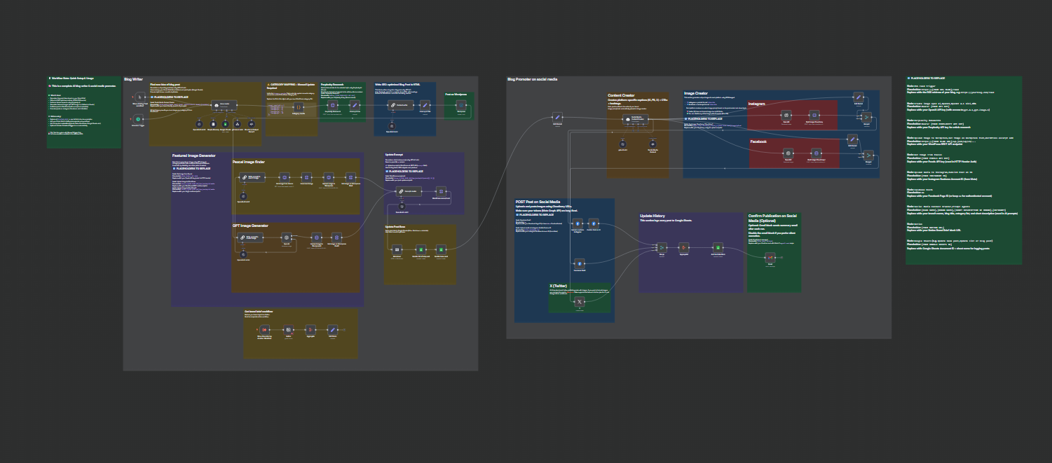 💡 Detailed Workflow Features ✅ Generates highly relevant, SEO-optimized blog articles (2000–2500 words) ✅ Incorporates up-to-date research for trustworthy, fact-based content ✅ Publishes directly to your WordPress blog with perfect HTML formatting, metadata, and excerpts ✅ Automatically creates engaging social posts tailored specifically for Instagram, Facebook & X ✅ Effortlessly schedules and posts across your social platforms without manual intervention ✅ Logs every action meticulously into Google Sheets for easy monitoring and transparent record-keeping ✅ Delivers detailed publication reports directly to your Gmail inbox (optional)