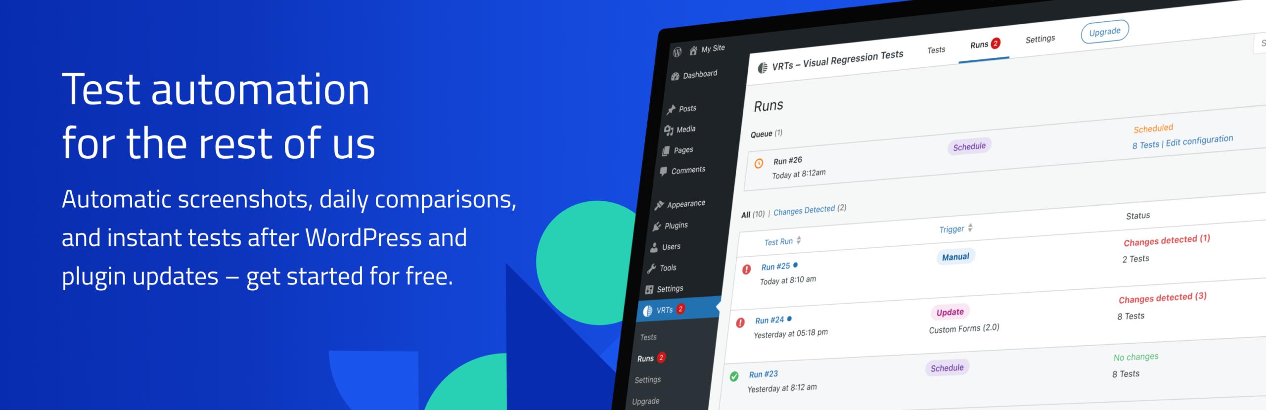 Find issues before others do – every time. With automatic screenshots, daily comparisons, and instant tests after WordPress and plugin updates. Select the pages of your choice for continuous monitoring. The plugin immediately notifies you of any visual changes it detects.